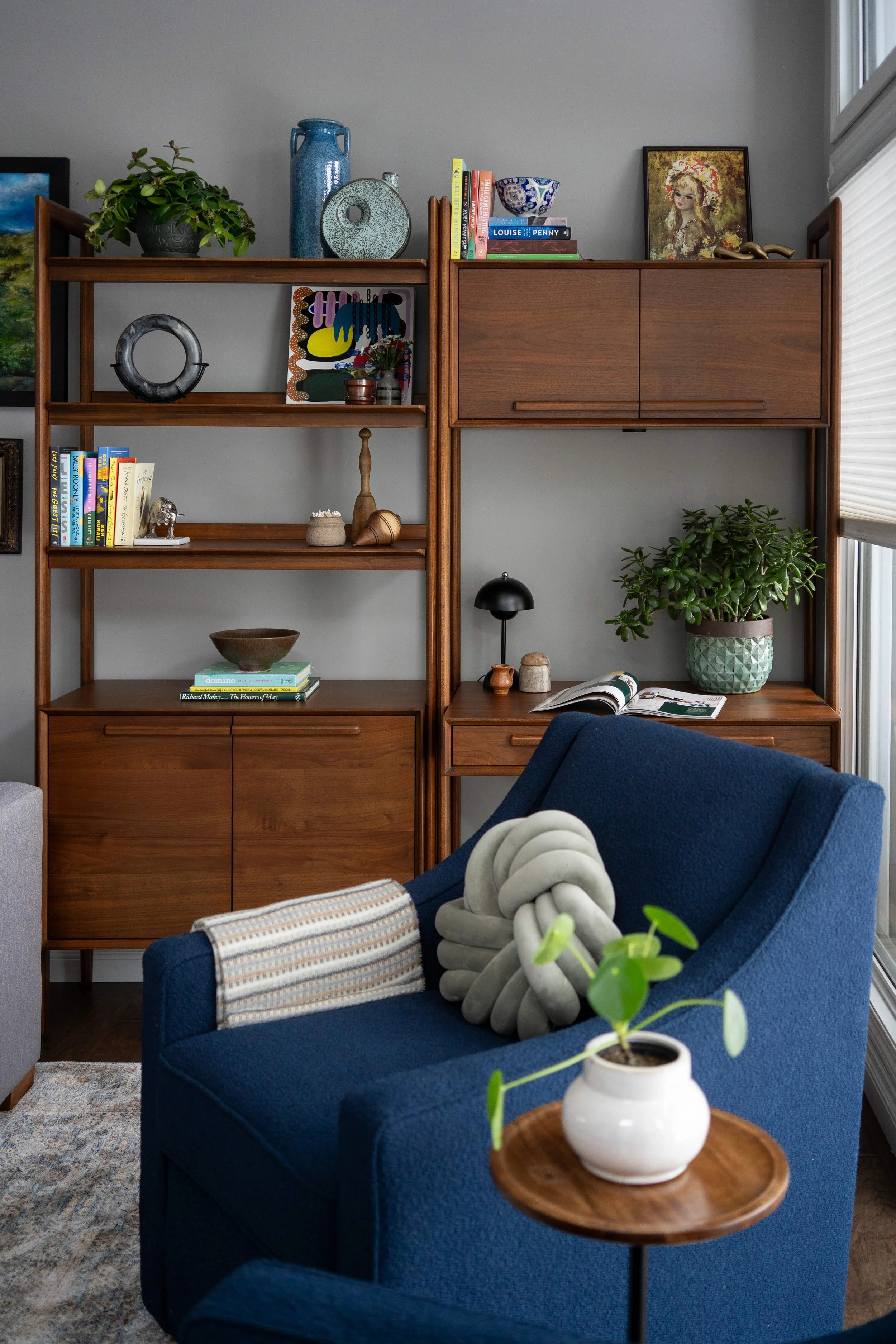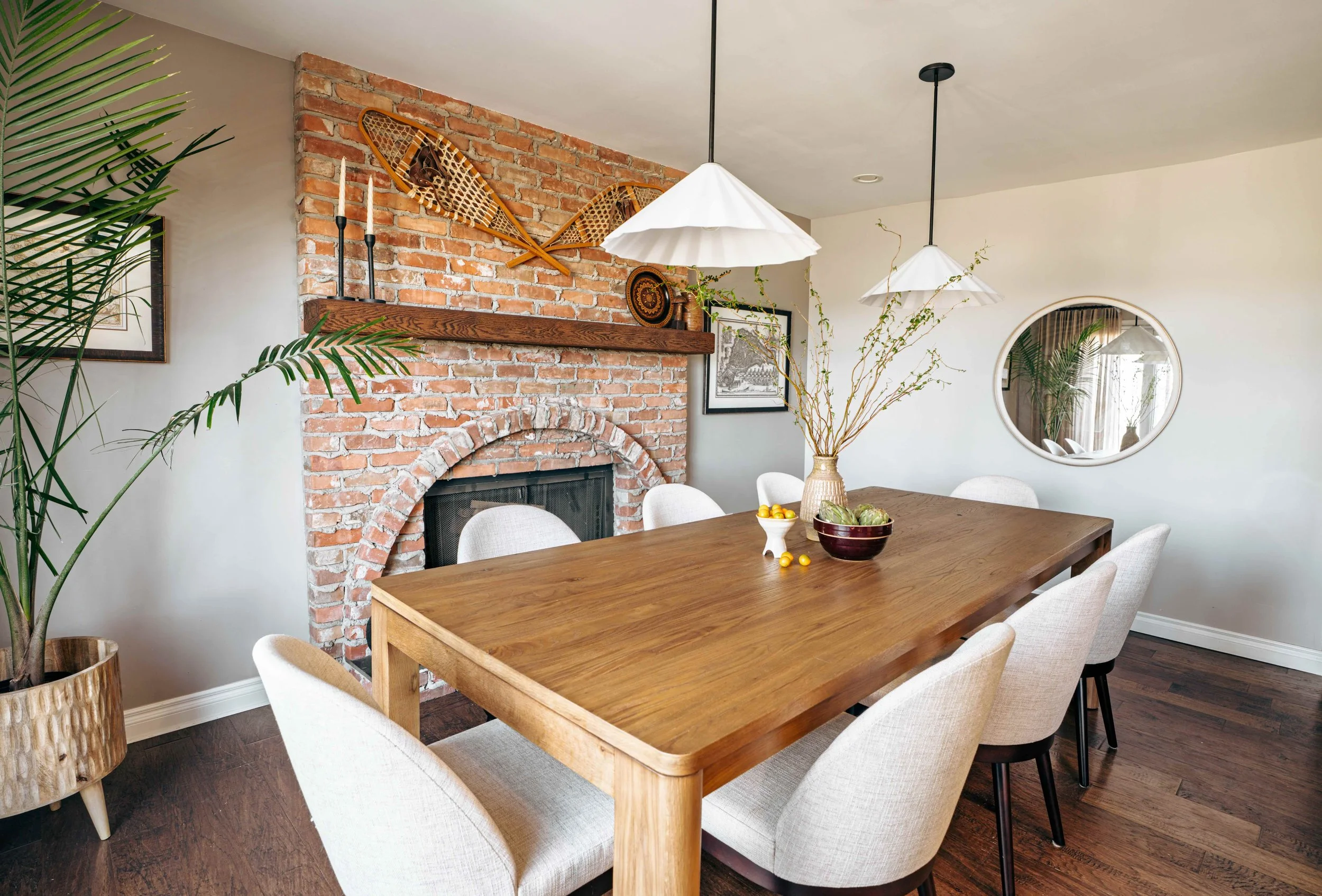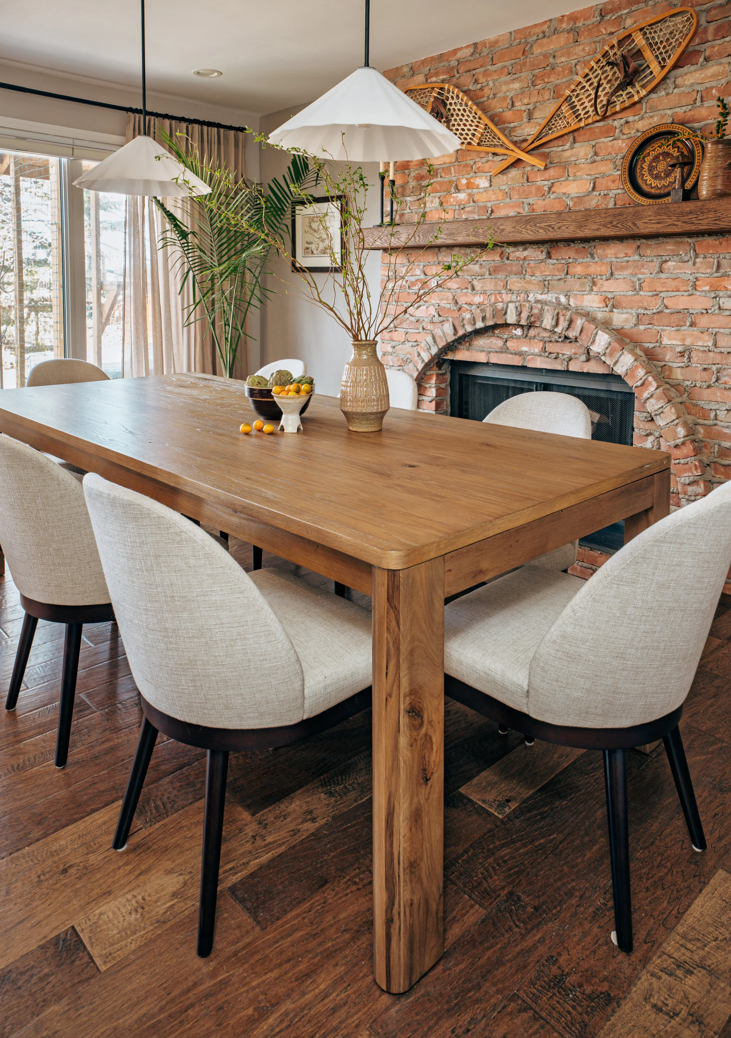 This project reimagined a main living room and dining area that previously went unused, despite being located just off the home’s entry. The clients wanted a space that felt comfortable and inviting while also supporting entertaining, family time, and a small work-from-home setup. A new floor plan introduced generous, comfortable seating and a dedicated workspace, creating a room that finally feels lived in and welcoming. Mid-century modern touches, including the coffee table and dining sideboard, were incorporated to honour both the home’s history and the clients’ style, while complementing the beautiful original brick fireplace. A new dining table now comfortably seats up to fourteen, making the space perfect for larger gatherings with family and friends.