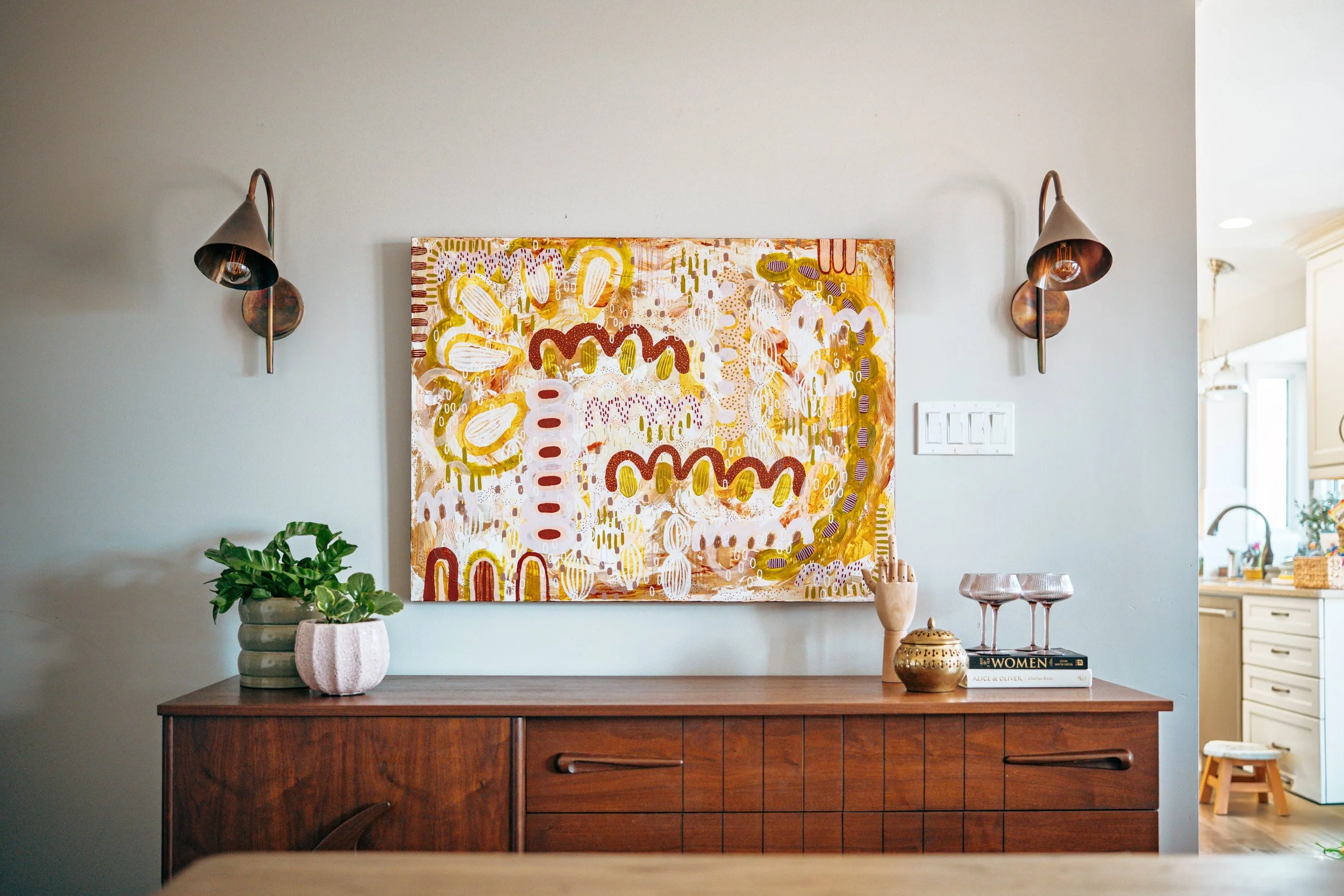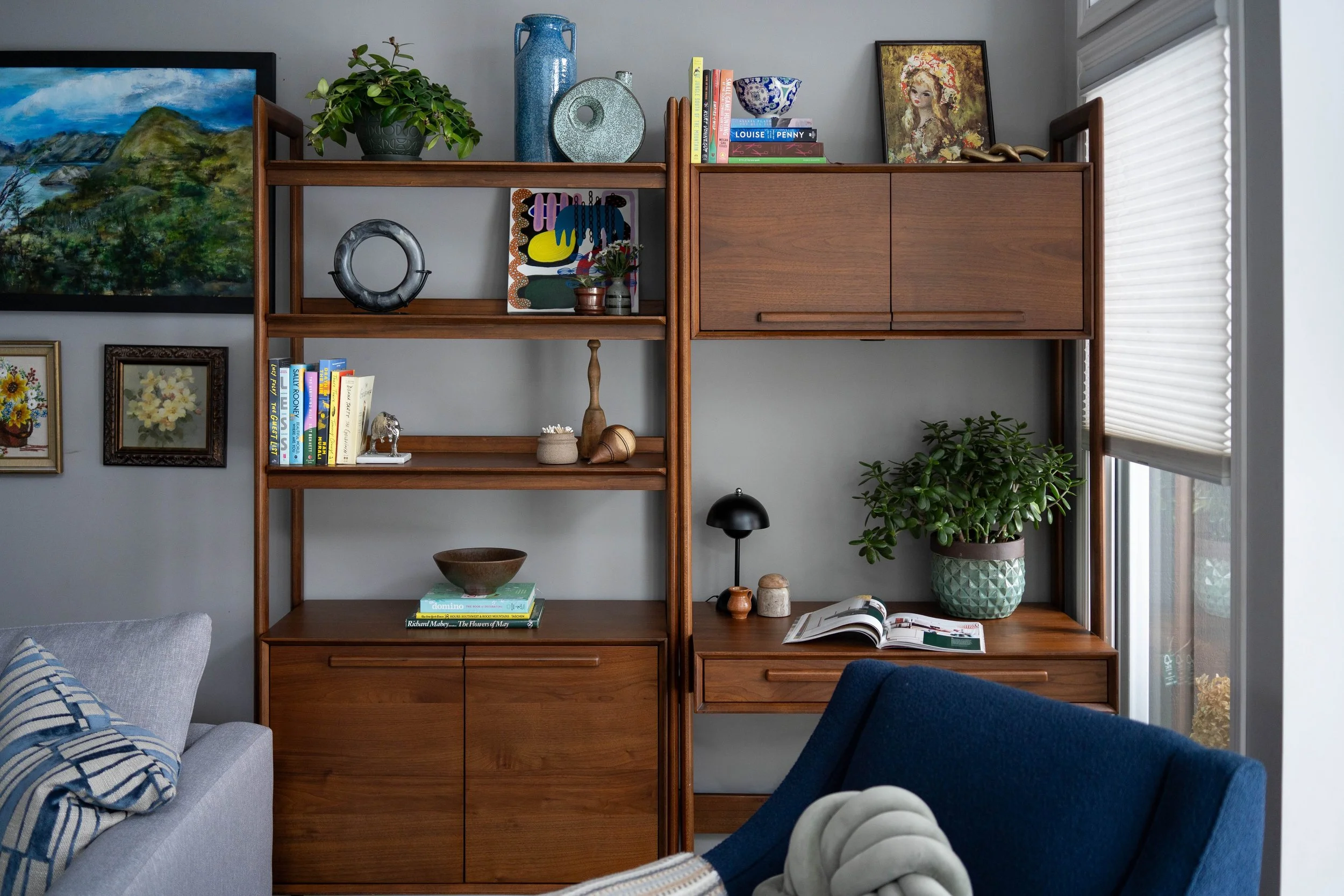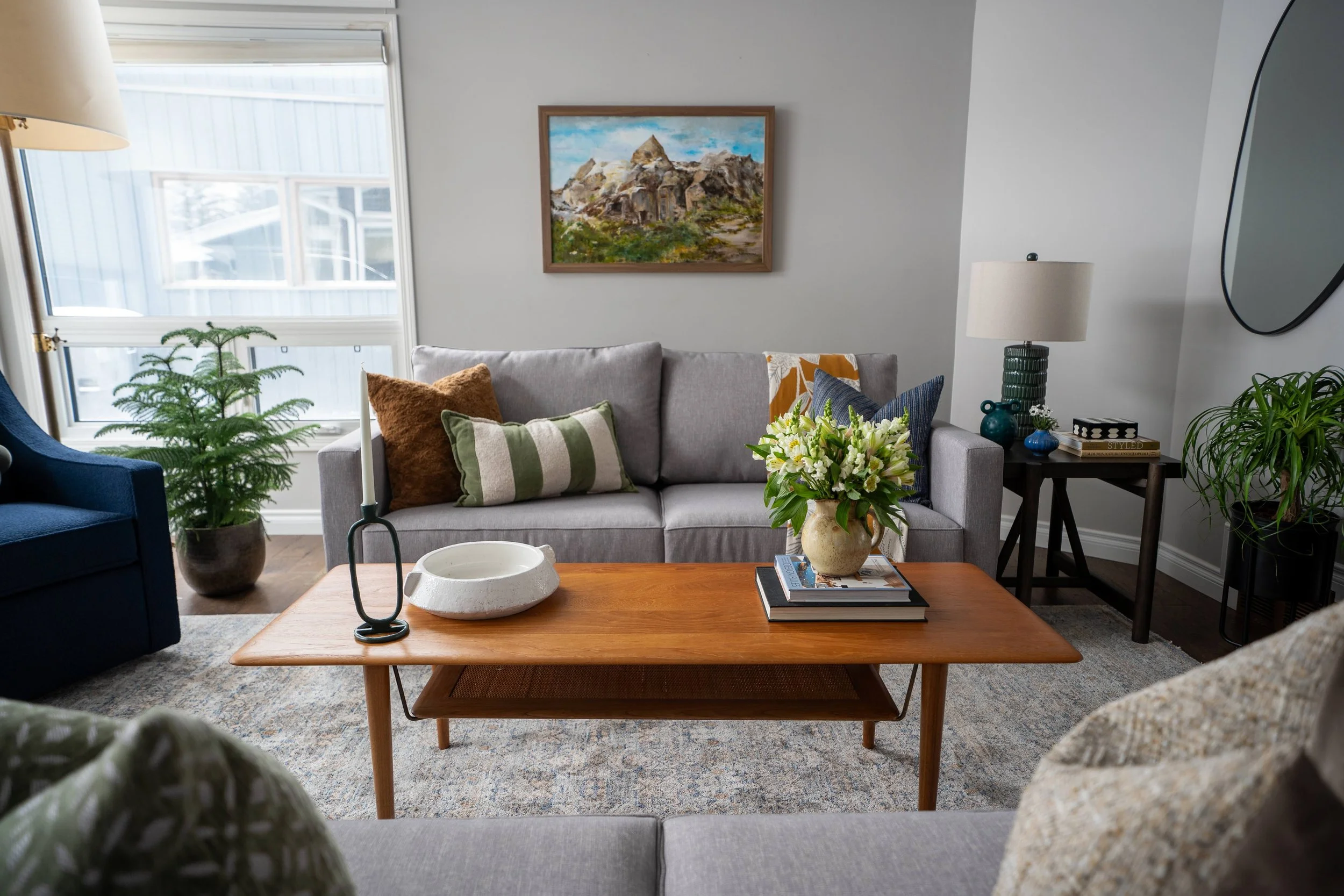 This project reimagined a main living room and dining area that previously went unused, despite being located just off the home’s entry. The clients wanted a space that felt comfortable and inviting while also supporting entertaining, family time, and a small work-from-home setup. A new floor plan introduced generous, comfortable seating and a dedicated workspace, creating a room that finally feels lived in and welcoming. Mid-century modern touches, including the coffee table and dining sideboard, were incorporated to honour both the home’s history and the clients’ style, while complementing the beautiful original brick fireplace. A new dining table now comfortably seats up to fourteen, making the space perfect for larger gatherings with family and friends.